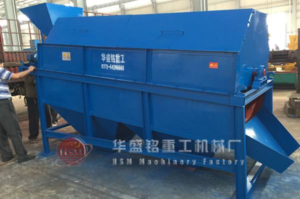 滚筒筛主要有电机、减速机、滚筒装置、机架、密封盖、进出料口组成。滚筒装置倾斜安装于机架上。电动机经减速机与滚筒装置通过联轴器连接在一起,驱动滚筒装置绕其轴线转动。当物料进入滚筒装置后,由于滚筒装置的倾斜与转动,使筛面上的物料翻转与滚动,使合格物料(筛下产品)经滚筒后端底部的出料口排出,不合格的物料(筛上产品)经滚筒尾部的排料口排出。由于物料在滚筒内的翻转、滚动,使卡在筛孔中的物料可被弹出,防止筛孔堵塞。